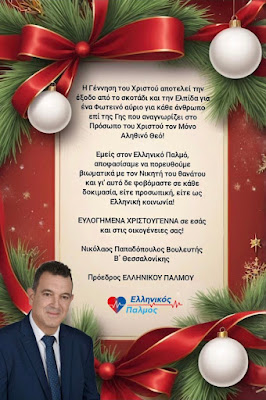Ευχές Χριστουγέννων από τον πρόεδρο του ΕΛΛΗΝΙΚΟΥ ΠΑΛΜΟΥ, ΝΙΚΟ ΠΑΠΑΔΟΠΟΥΛΟ